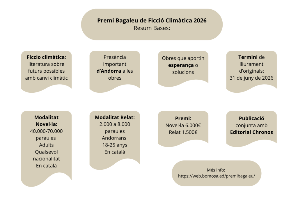 Fundació Bomosa, amb els objectius de prestigiar la literatura especulativa en català, fomentar el talent nou i estimular la reflexió sobre l’impacte del canvi climàtic, convoca el Premi Bagaleu de Ficció Climàtica amb la col·laboració del Ministeri de Cultura i Esports del Govern d’Andorra.